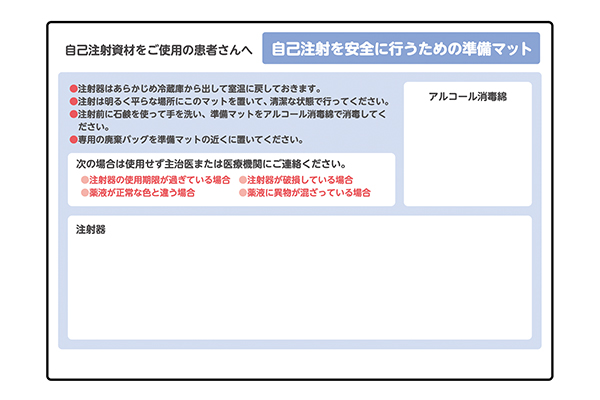薬剤、注射器、アルコール綿などを自己注射時に必要な資材を配置するマット。 何を準備し、どの順番で使用するか、流れを理解しスムーズな段取りで薬剤を投与できます。