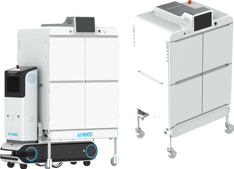 自律搬送ロボットAI-MHOSには、専用の多種多様なキャビネットをご用意しております。 全てが病院専用に設計され、他に類を見ない実用性と拡張性の高さが最大の特徴です。